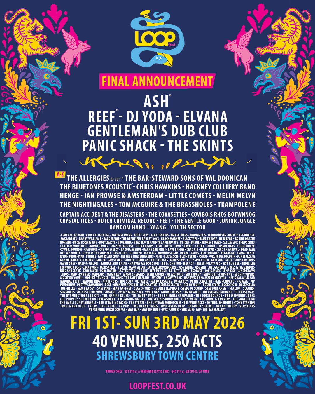 LOOPFEST is the biggest multi-venue festival in the West Midlands, with 250+ acts performing across Shrewsbury. Get access to all venues including The Quarry, Shrewsbury Castle, St. Mary’s Church, Theatre Severn plus many more on Saturday 2nd and Sunday 3rd May 2026 for just £40 (£6 for U14 and U5 free).